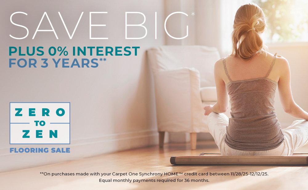 Shop. Save. Relax. Your perfect floors come with big savings*, zero worries, and zero interest for 3 years** at the Zero to Zen Flooring Sale.